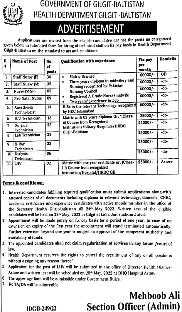 > Written test for the post of LHV will be scheduled on 28th May,2022 at DHQ Hospital Astore.