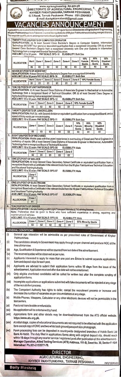 Govt. Dept : DIRECTORATE OF AGRICULTURAL ENGINEERING, KPK