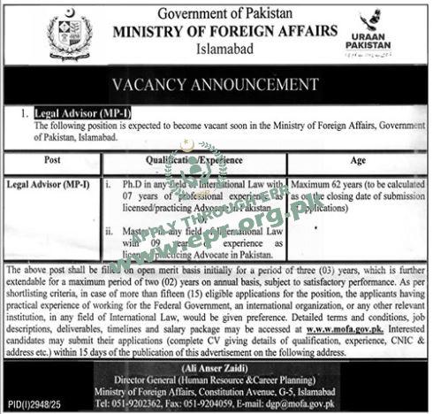 Ph.D in any field of International Law with 07 years of professional experience as licensed/practising Advocate in Pakistan. OR