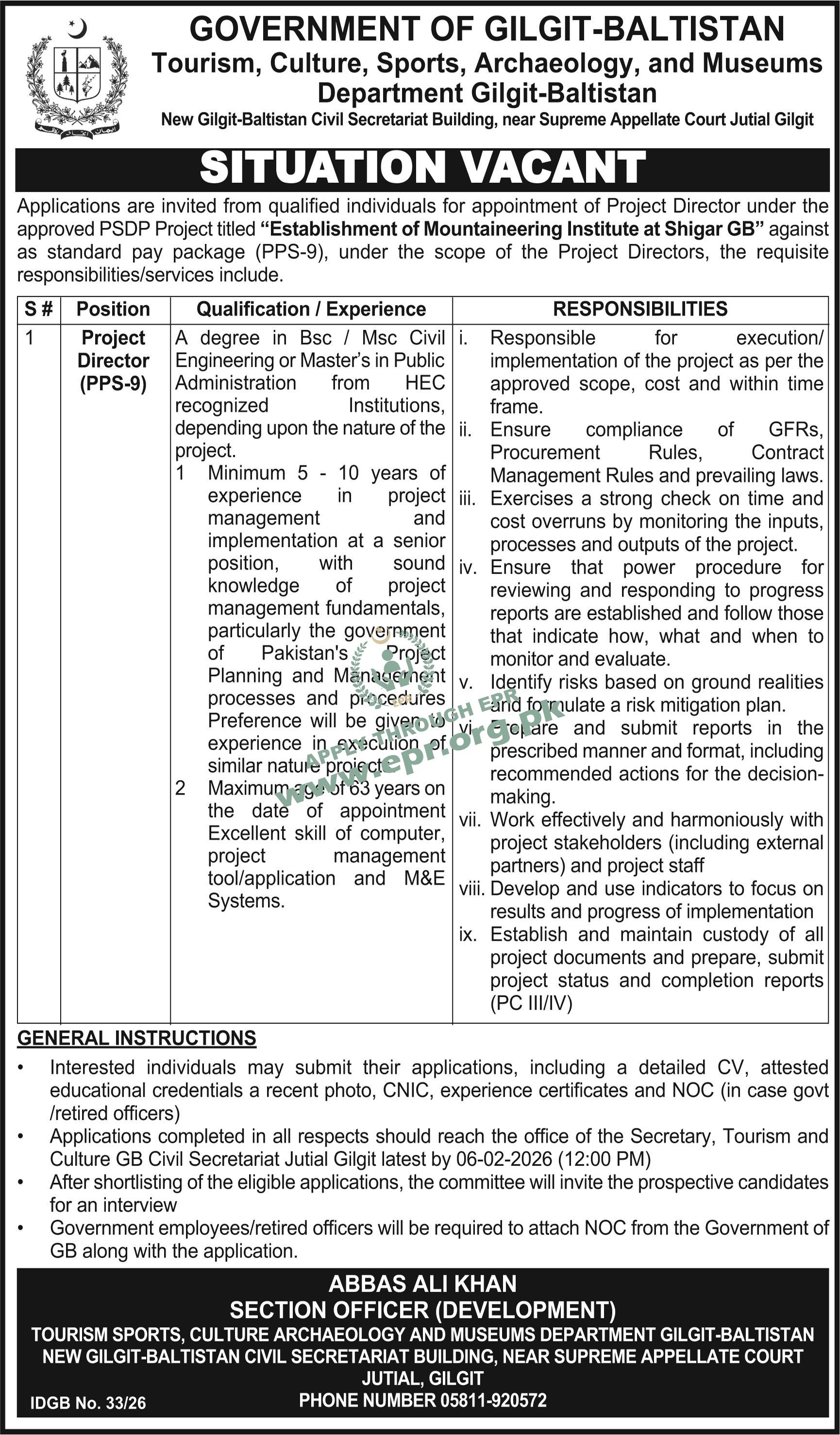 Govt. Dept : Tourism, Culture, Sports, Archaeology & Museums Department, GB