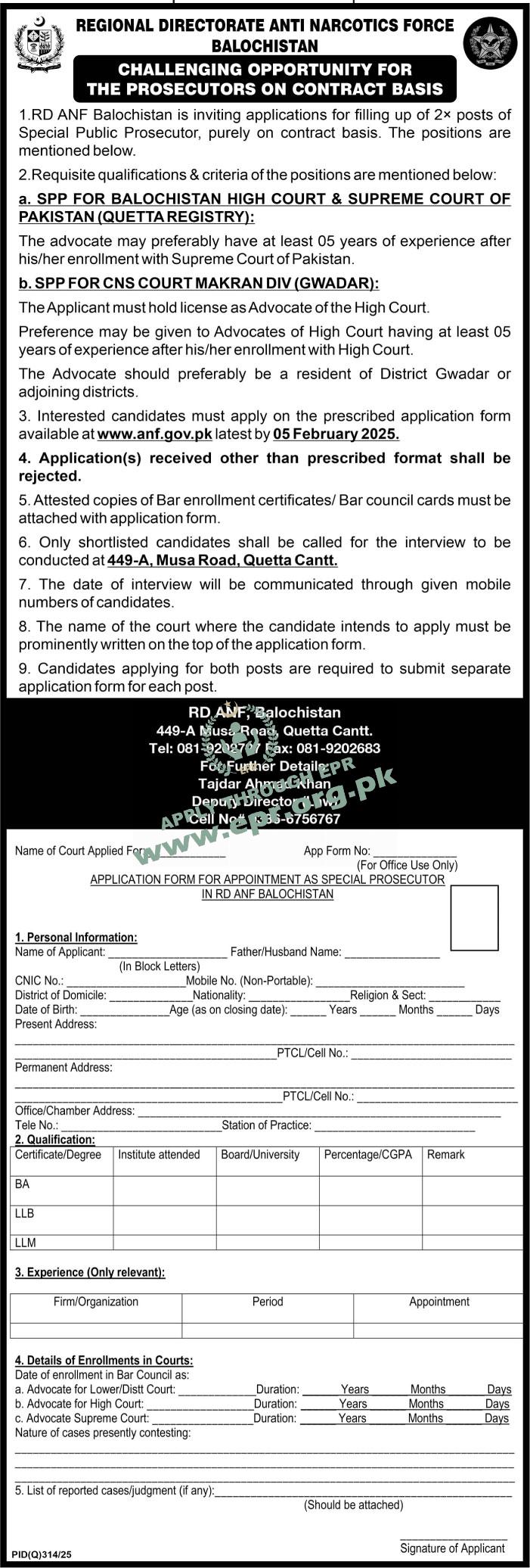 Govt. Dept : Regional Directorate Anti Narcotics Force Balochistan